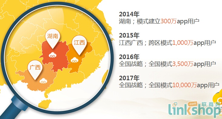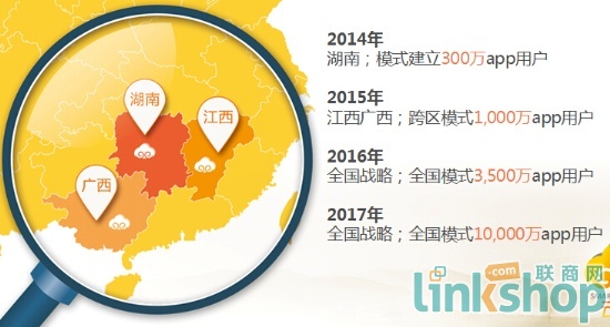 本地化核心價(jià)值的全國統(tǒng)一,我們有一個(gè)全國的戰(zhàn)略,自己給自己定了幾個(gè)目標(biāo)。第一個(gè)目標(biāo)是湖南省的APP用戶到年底達(dá)到300萬,2015廣西江西跨區(qū)模式1000萬APP用戶,2016年開始做全國戰(zhàn)略,3500萬APP用戶,準(zhǔn)備好能力,快速地去復(fù)制商業(yè)模式并推廣。2017年,希望活躍用戶能夠達(dá)到1個(gè)億。這是我們自己給自己定的一個(gè)目標(biāo),到2020年,我們希望云猴大平臺(tái),包括整個(gè)步步高,希望實(shí)現(xiàn)1500億的營業(yè)額,實(shí)體店500個(gè)億,電商平臺(tái)500個(gè)億,生活聯(lián)盟500億,我們的戰(zhàn)略愿景是要成為中國第一的O2O大平臺(tái)!