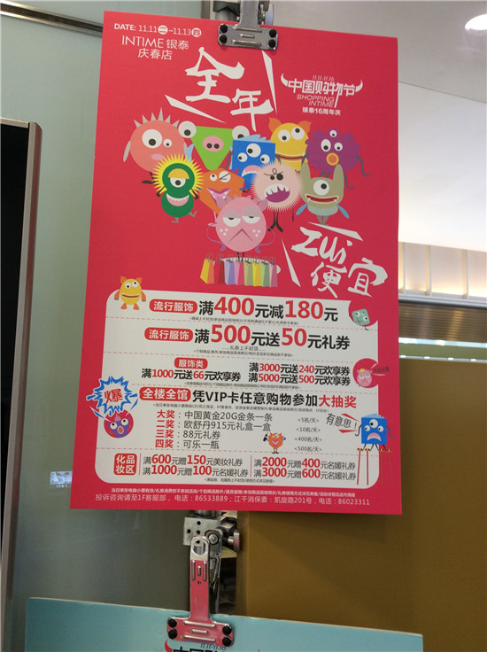 銀泰杭州慶春店線下雙11滿400減180 還送黃金