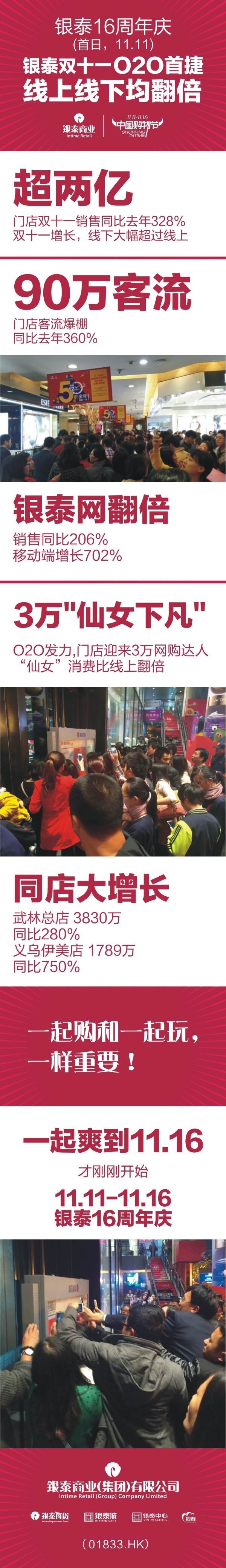 聯(lián)商快訊:昨天是銀泰16周年慶開始的首日,也是雙十一,銀泰方面表示,線上線下均翻倍,銷售額超過2億,同比去年增長328%,門店客流達90萬人次,同比去年增360%。