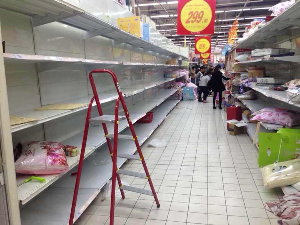 (歐尚超市紡織品全面半價(jià),幾乎被洗劫一空,場面不堪目睹哈。)