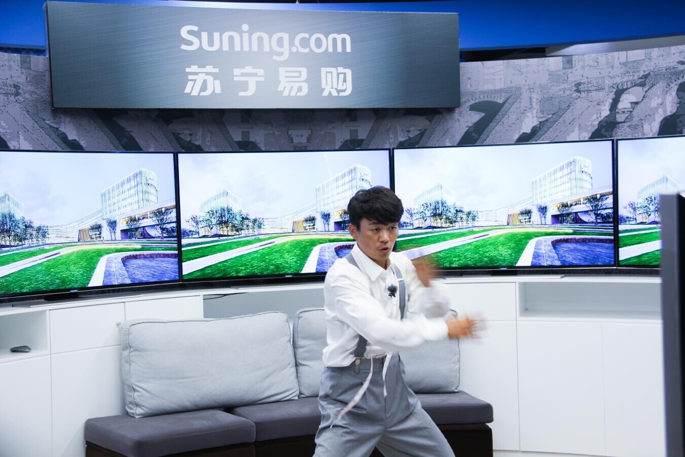 從劇照中,可以看到,身著民國服裝的“少林寶強(qiáng)”似乎在展示中國功夫,而背景則是現(xiàn)代化的蘇寧互聯(lián)網(wǎng)門店,皮質(zhì)沙發(fā)靠墊、蘇寧總部大樓照片都與王寶強(qiáng)形成鮮明的對比,且相映成趣。