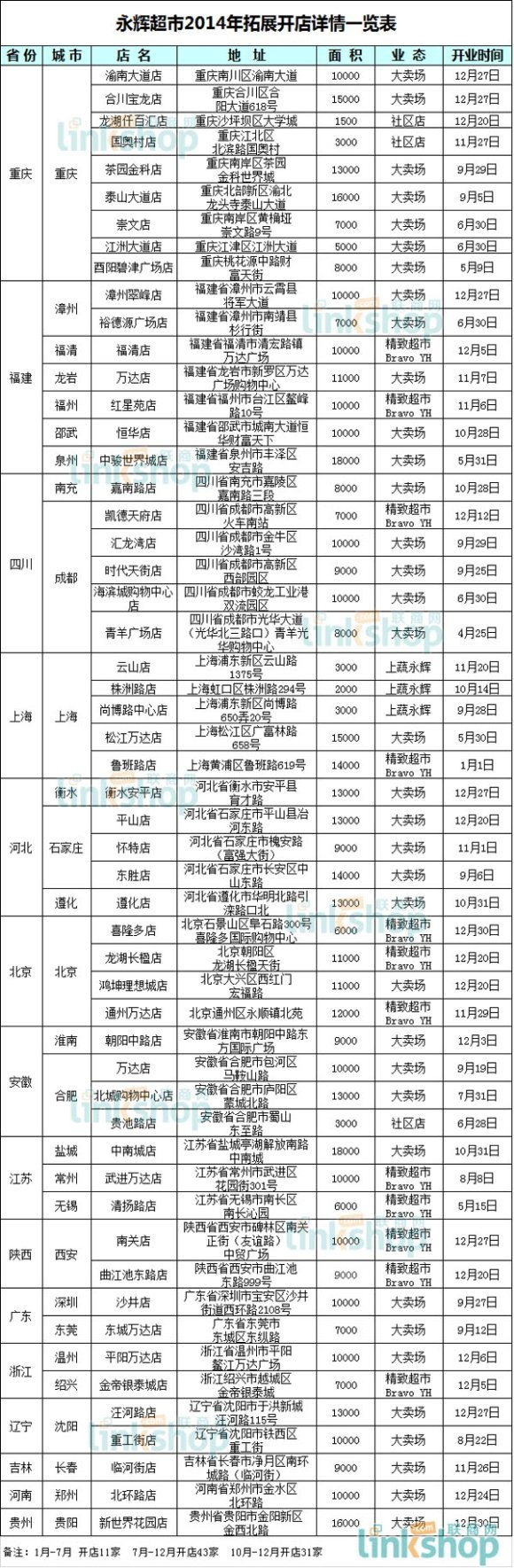據(jù)聯(lián)商網(wǎng)統(tǒng)計(jì)數(shù)據(jù)顯示,2014年永輝實(shí)現(xiàn)多元化業(yè)態(tài)布局,54家新門(mén)店中大賣(mài)場(chǎng)36家、Bravo YH精品超市12家、社區(qū)店3家、新業(yè)態(tài)上蔬永輝3家。