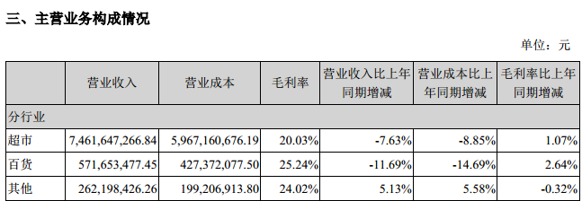 從業(yè)態(tài)劃分看,超市實現(xiàn)營業(yè)收入74.62億元,占公司總營業(yè)收入的93.01%;百貨實現(xiàn)營業(yè)收入5.72億元,占公司總營業(yè)收入的7.13%。