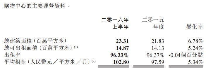 已開(kāi)業(yè)購(gòu)物中心總建筑面積達(dá)23.31百萬(wàn)平方米,較2015年底21.83百萬(wàn)平方米增長(zhǎng)6.78%。