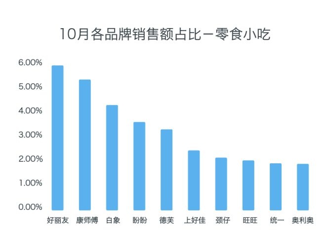好麗友、康師傅等知名度較高的一線品牌占據(jù)榜首?傮w而言,各品牌銷售額占比較為平均。