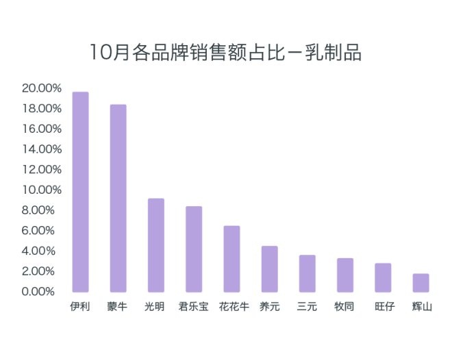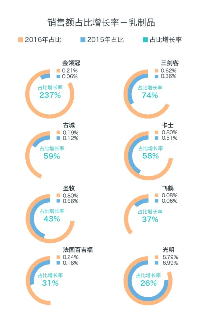 乳制品在總銷售額中的占比,相對(duì)去年大幅增長。二三線品牌增幅迅猛,三劍客等地方品牌也進(jìn)入視線。