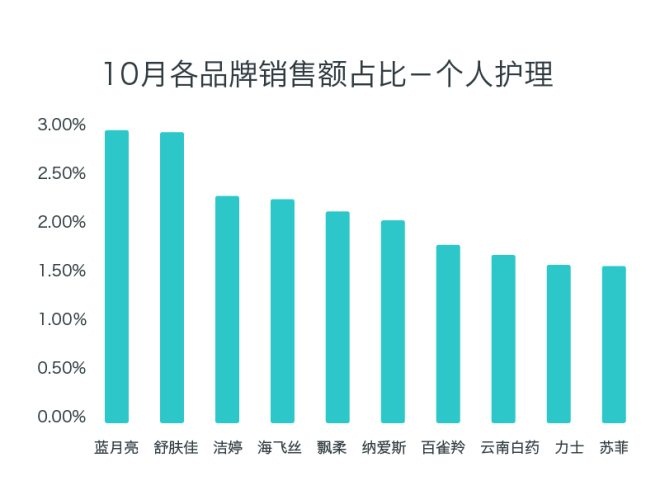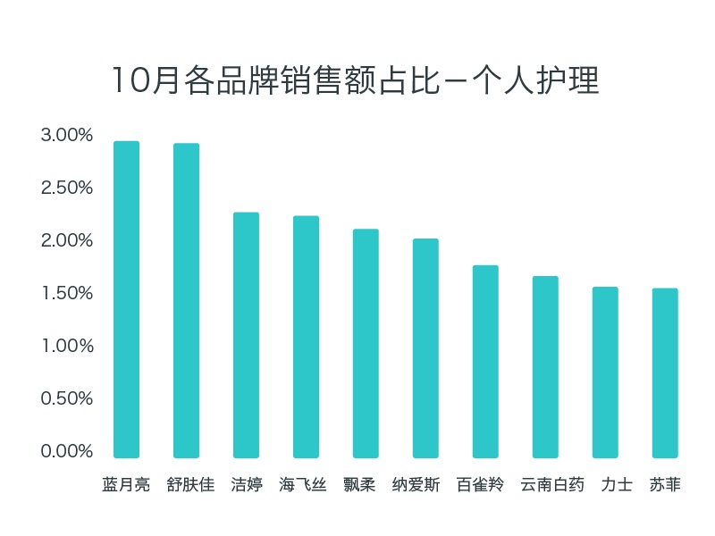 個(gè)人護(hù)理在總銷售額中的占比,因季節(jié)變化增幅較大。各品牌銷售占比較為分散。