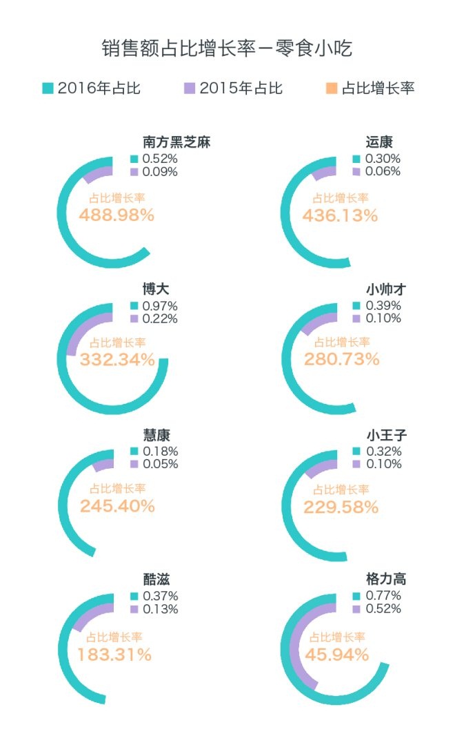 零食小吃的銷售額占比,雖較去年小幅下降,但部分品牌在2016年仍大幅增長,搶占更多市場(chǎng)份額。