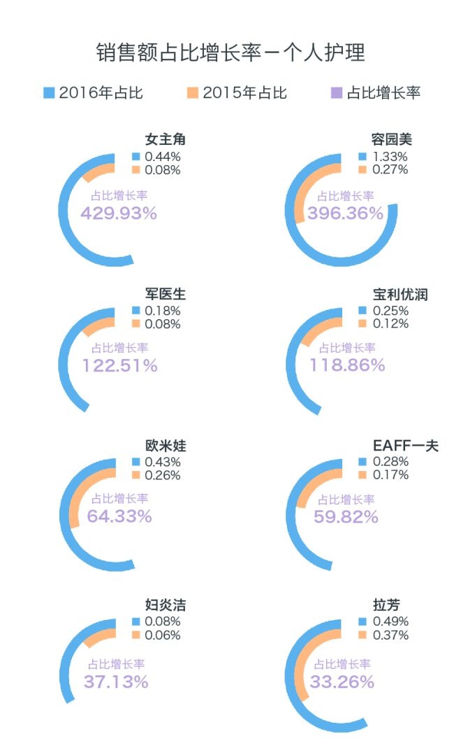 與零食小吃類似,僅軍醫(yī)生、婦炎潔、拉芳3個(gè)品牌為人熟知,高增長率的小品牌數(shù)量眾多。