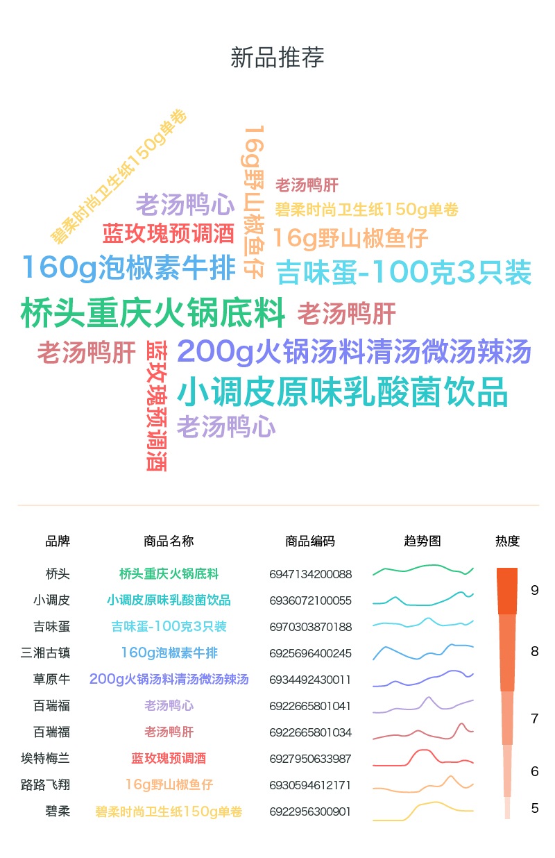 根據(jù)近兩個(gè)月才出現(xiàn)的新品的歷史銷售數(shù)據(jù),報(bào)告推薦了10個(gè)值得關(guān)注的新品。