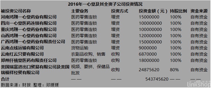 以下為2016年一心堂及其全資子公司投資情況: