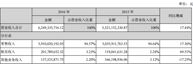 聯(lián)商網(wǎng)消息:2月27日晚,一心堂(002727)發(fā)布2016年度報(bào)告。報(bào)告表示,2016年公司實(shí)現(xiàn)營業(yè)總收入62.49億元,較上年同期提高17.44%;歸屬于上市公司股東的凈利潤3.53億元,較上年提高2.06%。