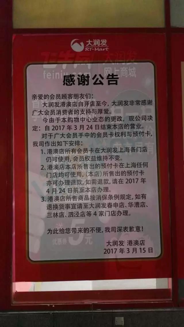 有網(wǎng)友爆料,就在3月14日晚上閉店后,大潤發(fā)上海港澳店已貼出了公告。公告顯示,港澳店所有會員卡以及所售出的預(yù)付卡在大潤發(fā)上海各門店仍可使用,此外如有退貨,可以到大潤發(fā)春申店、華漕店、三林店、泗涇店等4家門店辦理,并且店外貼出了通往上述4家店的班車及路線。