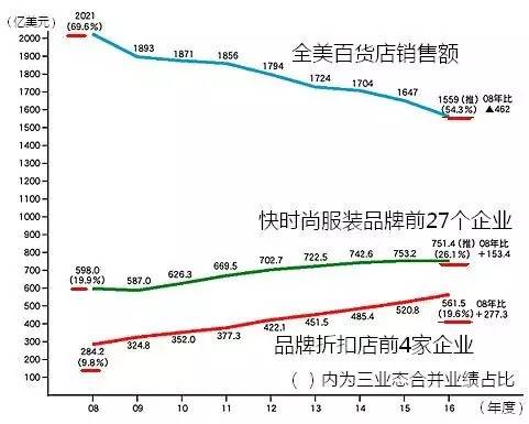 附圖是百貨店業(yè)績(jī)、快時(shí)尚企業(yè)業(yè)績(jī)、品牌折扣店業(yè)績(jī)趨勢(shì)的對(duì)比。