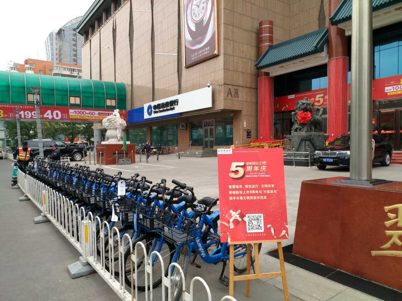 據(jù)了解,4月19日至23日,用戶掃二維碼可享“小藍單車”優(yōu)惠騎行活動。而4月19日至23日翠微會進行上市慶大酬賓,每年都會吸引數(shù)十萬客流,為鼓勵人們綠色出行、文明共享,以此為平臺,翠微大廈在翠微店、當代商城中關村店、甘家口百貨店、牡丹園店、大成路店設立共享單車文明停放示范點,設立專門的管理員引導大家文明停放。