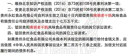 今年5月16日,北京市高院就貴陽南明老干媽公司起訴貴州永紅食品“老干媽”商標(biāo)侵權(quán)案作出終審判決,判令貴州永紅公司立即停止使用“老干媽”字樣。最終法院判定,老干媽獲賠金額合計(jì)為60.15萬元。