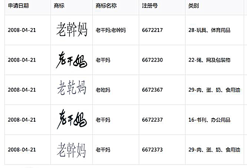 近年來為防止商標(biāo)侵權(quán),貴陽老干媽公司先后申請(qǐng)注冊(cè)過“老干爹”、“陶老干爹”、“陶老干爺”、“陶老干爸”、“陶老干兒”、“陶老干媽”、“陶華碧新干媽”、“陶華碧老干娘”、“陶華碧老親娘”、“陶華碧老親媽”等商標(biāo)名稱。