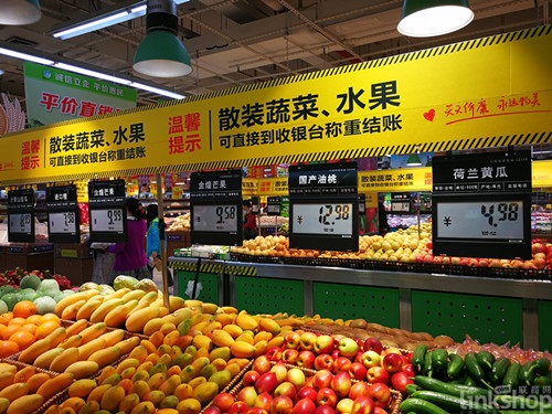 盒馬鮮生由阿里集團投資,主營生鮮商品和餐飲服務(wù),線下線上同時經(jīng)營。線下門店承載的功能較傳統(tǒng)零售門店進一步增加,集“生鮮超市+餐飲體驗+線上業(yè)務(wù)倉儲配送”為一體。盒馬鮮生開業(yè)時,其日配百貨、蔬果區(qū)以及面包區(qū)域便已經(jīng)使用電子價簽,現(xiàn)在,店內(nèi)95%的商品都使用了電子價簽,剩下的5%為餐飲燒烤商品。