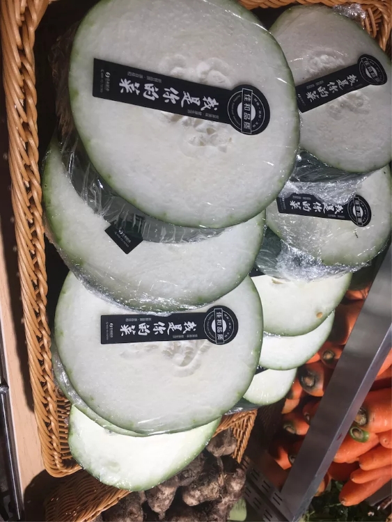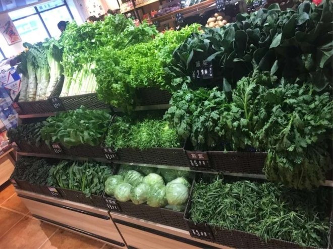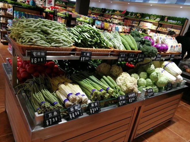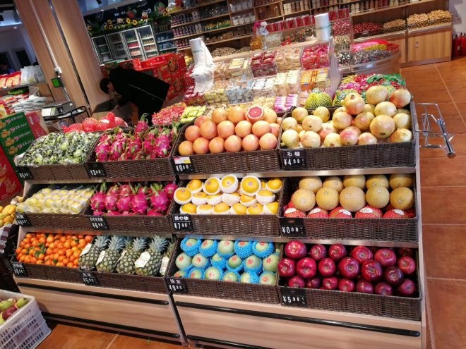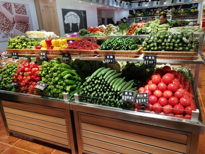 ▲果蔬區(qū)的堆頭經(jīng)過精心設(shè)計(jì),并不是簡單的堆砌,小道具的配合使用讓新鮮果蔬的陳列顯得更有生活氣息。