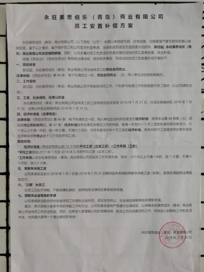 美思佰樂總部和門店的員工在看到安置補償方案后,部分員工認為不合理,然后到公司總部和永旺青島東部店集合抗議。