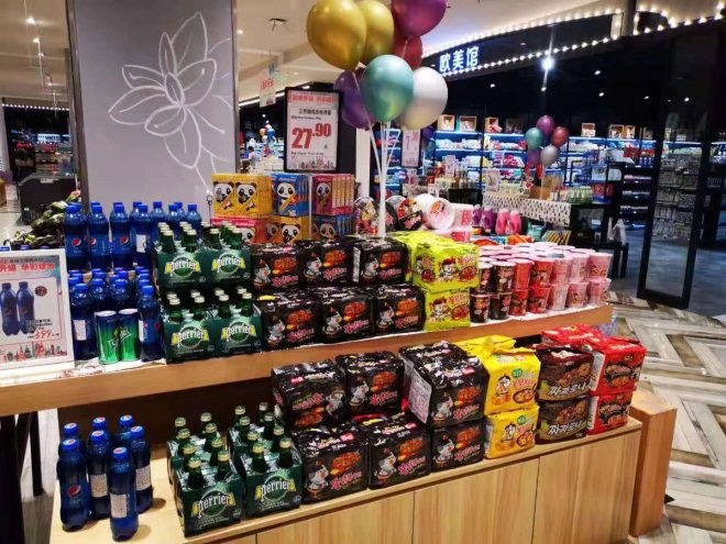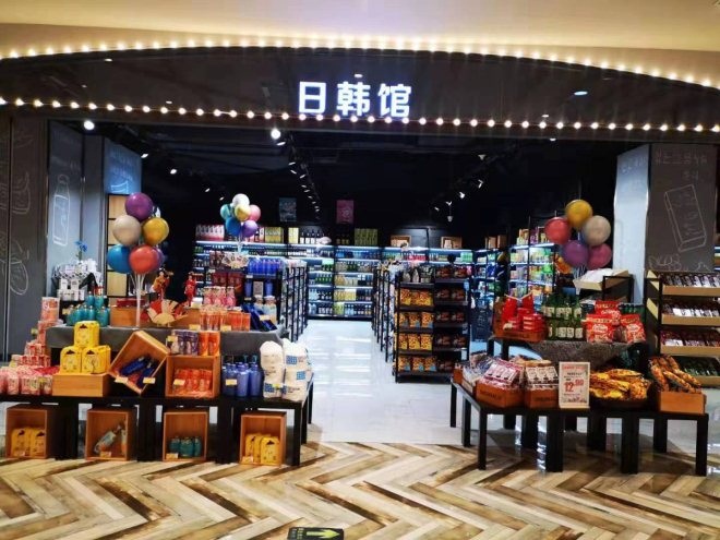 在日韓館,既有日本的醬油如萬字醬油、拉面、大米、清酒、梅子酒,韓國的燒酒、大醬、柚子茶、火雞面、方便面,最為出名的零食各種口味的海苔以及醬油漿料系列,還有日韓美妝、鍋品等。