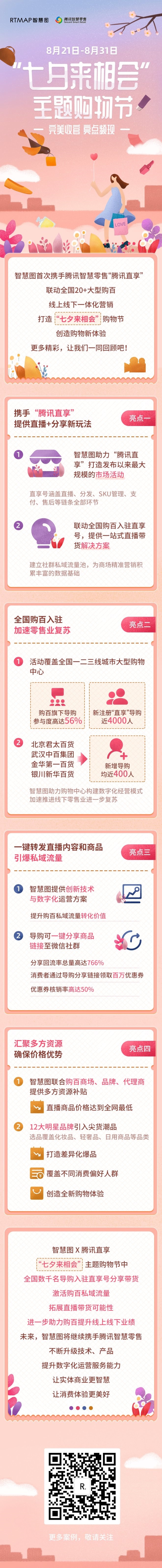 8月21日至8月31日,智慧圖以騰訊智慧零售最新重磅產(chǎn)品“騰訊直享”為平臺(tái),舉辦了“騰訊直享”發(fā)布以來(lái)最大規(guī)模的一次市場(chǎng)活動(dòng)——“七夕來(lái)相會(huì)”主題購(gòu)物節(jié)。智慧圖攜手騰訊智慧零售,通過(guò)“直播+導(dǎo)購(gòu)分發(fā)帶貨”模式促進(jìn)直播帶貨進(jìn)一步朝精細(xì)化、高轉(zhuǎn)化導(dǎo)向發(fā)展,不斷為傳統(tǒng)購(gòu)物中心、百貨商場(chǎng)的數(shù)字化升級(jí)增添新動(dòng)力。