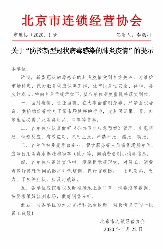 2月4日,為全面落實(shí)商務(wù)部、北京市商務(wù)局關(guān)于做好春節(jié)期間市場(chǎng)保供工作要求,有序統(tǒng)籌做好生活必需品保障供應(yīng),千方百計(jì)滿足消費(fèi)者節(jié)慶生活需要,北京市連鎖經(jīng)營(yíng)協(xié)會(huì)作出重要提示,引導(dǎo)會(huì)員單位及本市連鎖企業(yè)全力保障市場(chǎng)供應(yīng),有力防控疫情,在“人員、資金、商品、設(shè)備、消防、交通”等方面不出現(xiàn)問題。