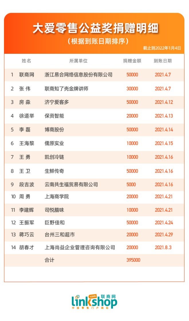 “大愛零售公益獎”一經(jīng)啟動,便受到了多位零售愛心人士的響應(yīng),他們紛紛慷慨解囊。截至8月3日17時,已經(jīng)有14家企業(yè)或其掌門人、個人為大愛零售公益獎捐款。具體名單如下:
