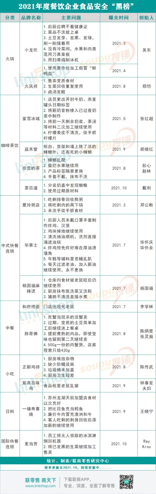 為此,《聯(lián)商網(wǎng)》特整理了2021年度餐飲企業(yè)食品安全“黑榜”,用來記錄2021年餐飲企業(yè)經(jīng)營過程中的被爆出的食品安全問題。(榜單更新至2021.10,并將持續(xù)更新)
