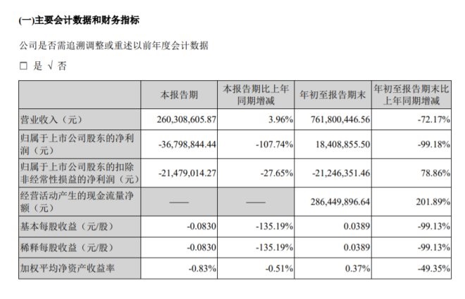 今年第三季度,好想你實現(xiàn)營收2.60億元,同比增加3.96%;歸屬上市公司股東的凈利潤為-3679.88萬元,同比下降107.74%。前三季度,好想你實現(xiàn)營收7.62億元,同比下降72.17%;歸屬上市公司股東的凈利潤1840.89萬元,同比下降99.18%。