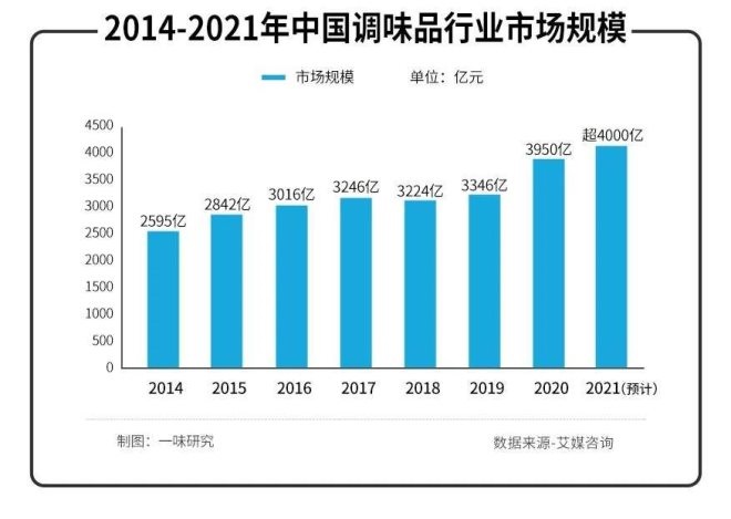 艾媒咨詢《2014-2021年中國調味品行業(yè)研究報告》顯示,2020年中國調味品行業(yè)市場規(guī)模達到3950億元,同比增長15.3%,預計2021年市場規(guī)模將突破4000億元。