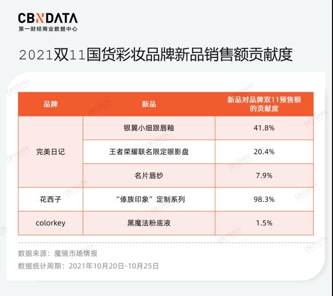 不過,品牌不同的上新邏輯,發(fā)揮的效果也有參差。完美日記、花西子都選定強勢品類推出新品,且基本是在原有爆款基礎(chǔ)上迭代色號或質(zhì)地。這類新品對品牌銷售額的貢獻度非常高,花西子雙11預(yù)售額幾乎全由“傣族印象”系列新品承包;完美日記三款新品對預(yù)售額的貢獻也達到近7成。colorkey的推新邏輯則不同,其跳出最強的唇妝領(lǐng)域,發(fā)力底妝推出新品,體現(xiàn)品牌在品類拓展上的決心。但從結(jié)果來看,這款新品僅貢獻品牌不到2%的預(yù)售額。