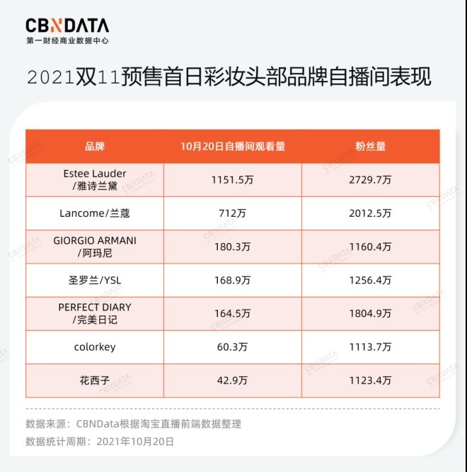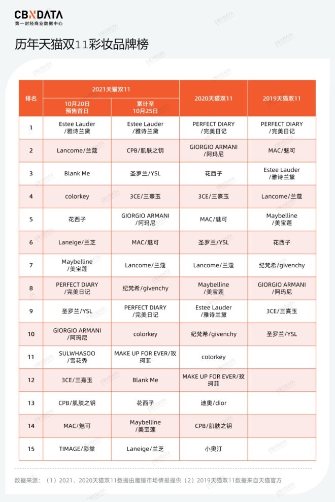 不過,國貨彩妝品牌的排位正在發(fā)生變化,這一趨勢在618期間就有體現(xiàn)。今年天貓618,花西子摘下彩妝榜冠軍,昔日風頭無兩的完美日記則被擠到第三位。而到雙11,花西子和完美日記的火力從一開始就被colorkey壓制。直到10月25日預(yù)售過半之際,完美日記才以微弱優(yōu)勢反超colorkey,暫回國貨彩妝第一;ㄎ髯痈菑念A(yù)售首日的第五名掉出前十。國貨彩妝似在上演“風水輪流轉(zhuǎn)”。