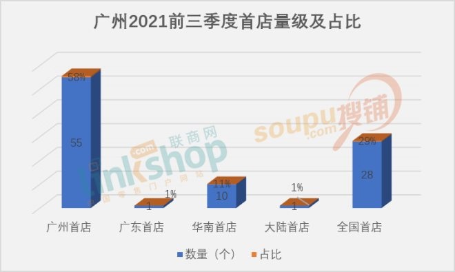 從首店量級上看,廣州首店55家、占比約58%;廣東首店1家,占比約1%;華南首店10家、占比約11%;大陸首店1家,占比約1%;全國首店28家、占比約29%。并無亞洲首店及全球首店的量級。