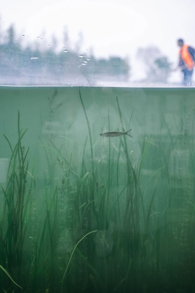 進(jìn)入下沉式的書(shū)店主空間,近一米深的水下玻璃幕墻成為最亮眼的吸睛之處,站在書(shū)店中,仿佛置身于“水下世界”,半透明的藍(lán)綠色湖水中水草豐盛,偶有魚(yú)兒游過(guò),營(yíng)造了靈動(dòng)、奇妙的閱讀氛圍。