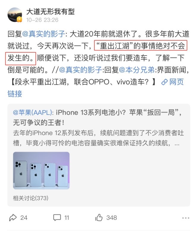 退隱已久的段永平也被拉回公眾視野。他在雪球上以“大道無形我有型”之名回應(yīng)表示:“大道20年前就退休了。很多年前大道就說過,‘重出江湖’的事情絕對不會發(fā)生!