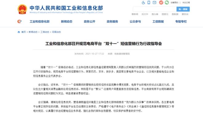 10月25日,工信部召開指導會,針對“雙十一”營銷類垃圾短信投訴現(xiàn)象,提出電商平臺不得未經(jīng)消費者同意或請求擅自發(fā)送營銷短信。