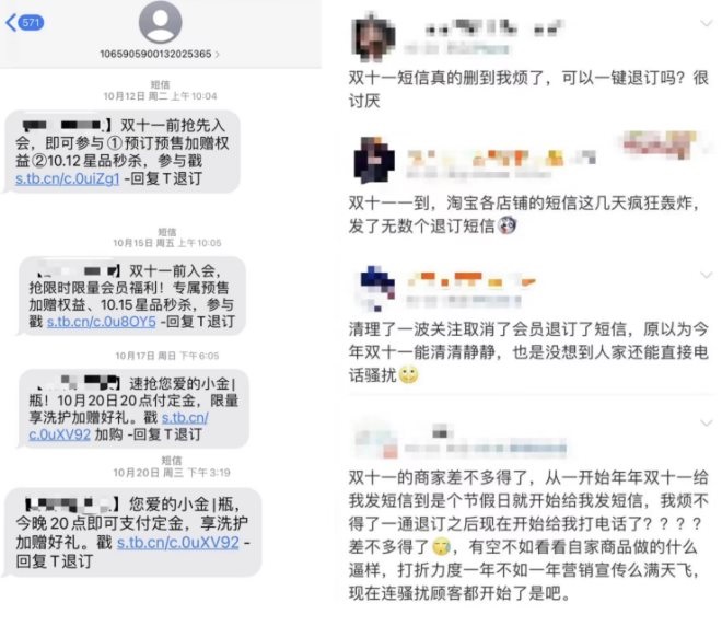 不少網(wǎng)友也反映“雙十一預售開啟,就收到幾十條甚至上百條電商商家的促銷短信”,更有消費者表示:“清理了一波關注,取消了會員,退訂了短信,原以為今年雙十一可以清清靜靜,沒想到人家還能直接電話騷擾。”