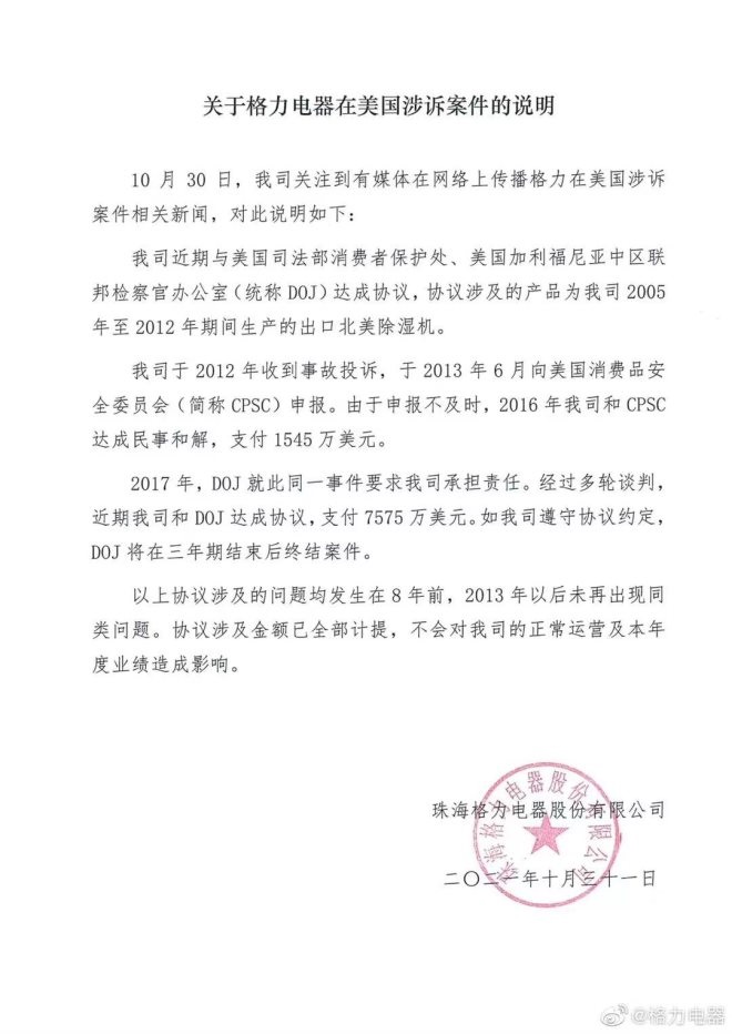 聯(lián)商快訊:10月31日,格力電器發(fā)布關于在美國涉訴案件的說明稱,公司近期與美國司法部消費者保護處、美國加利福尼亞中區(qū)聯(lián)邦檢察官辦公室(統(tǒng)稱DOJ)達成協(xié)議,協(xié)議涉及的產品為公司2005年至2012年期間生產的出口北美除濕機。公司于2012年收到事故投訴,于2013年6月向美國消費品安全委員會(簡稱CPSC)申報。由于申報不及時,2016年公司和CPSC達成民事和解,支付1545萬美元。2017年,DOJ就此同一事件要求公司承擔責任。經(jīng)過多輪談判,近期公司和DOJ達成協(xié)議,支付7575萬美元。如公司遵守協(xié)議約定,DOJ將在三年期結束后終結案件。
