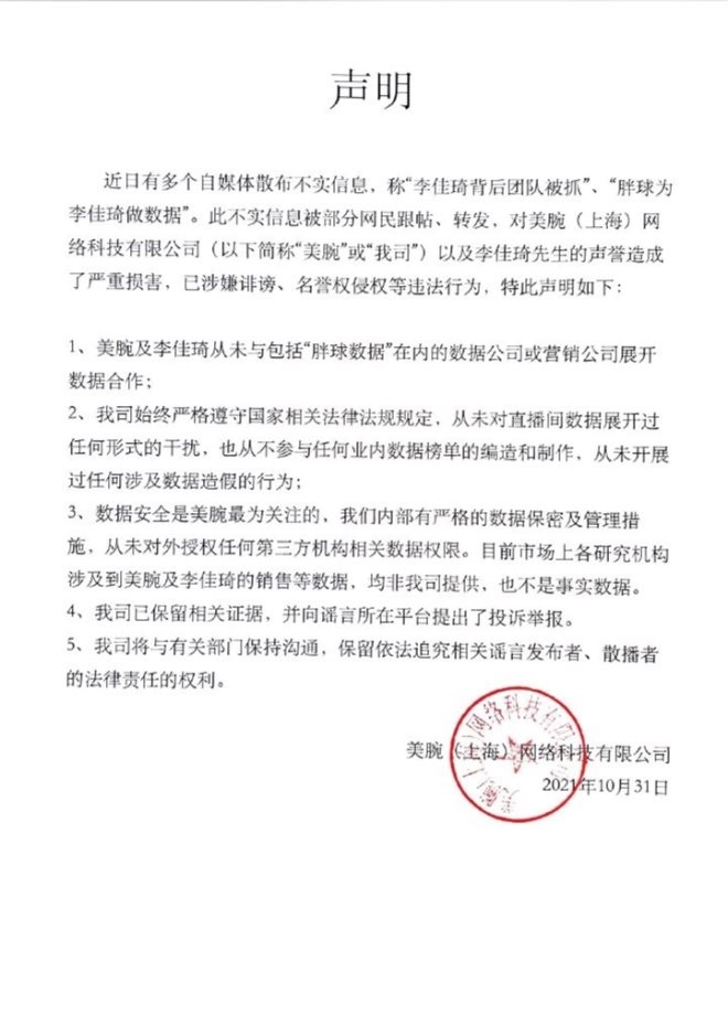 1、美腕及李佳琦從未與包括“胖球數(shù)據(jù)”在內(nèi)的數(shù)據(jù)公司或營銷公司展開數(shù)據(jù)合作;