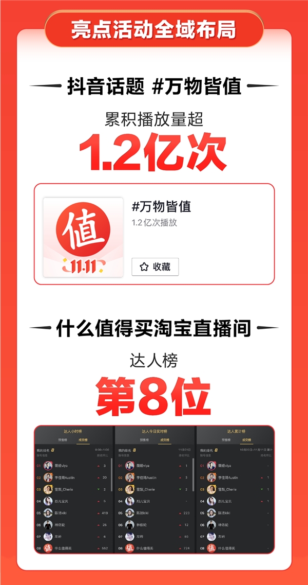 什么值得買淘寶直播間作為淘寶直播間的媒體TOP級賬號,大促期間取得了達人小時榜、實時榜、累計榜均排名第8的好成績,還與新華社、央視新聞等一同入選了淘寶直播五星聯播項目,并將在11月10日帶給全網用戶更多優(yōu)質商品與內容。