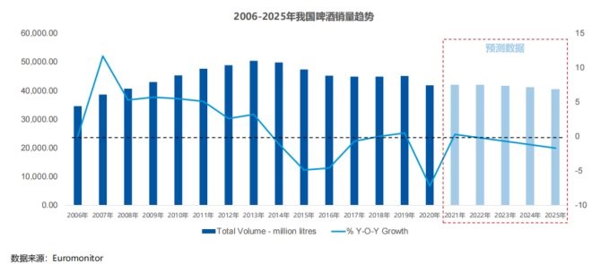 Euromonitor數(shù)據(jù)顯示,我國啤酒總產(chǎn)量和銷量自2005年起均呈現(xiàn)明顯增長態(tài)勢,并于2013年達(dá)到頂峰,總產(chǎn)量和銷量均突破5000萬千升,隨后便進(jìn)入下滑區(qū)間,2020年因疫情導(dǎo)致的餐飲門店限流和聚會(huì)聚餐減少進(jìn)一步加劇了這個(gè)下滑趨勢。