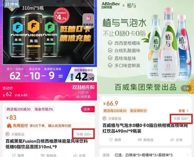“高端”市場失守后,百威亞太在今年推出兩大飲料新品以期“彎道超車”。兩款產(chǎn)品分別是能量飲料黑氪和蘇打氣泡水植與,均以0卡為特色標(biāo)簽。但目前看來兩款產(chǎn)品的銷量并不理想,天貓百威英博飲料旗艦店數(shù)據(jù)顯示,自6月份上架至今的四個(gè)多月里,黑氪(白桃西柚)月銷僅300+件,累計(jì)評價(jià)318條;植與(白桃柑橘荔枝)月銷也不過500+件。