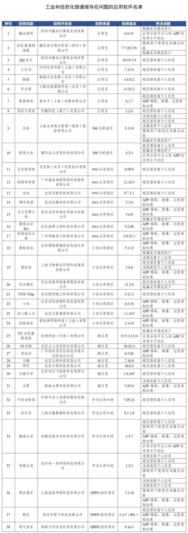 11月13日,工業(yè)和信息化部信息通信管理局發(fā)布38款存在問題的APP名單,這些APP存在超范圍、高頻次索取權(quán)限,非服務場景所必需收集用戶個人信息,欺騙誤導用戶下載等違規(guī)行為。據(jù)悉,上述APP應在11月9日前完成整改,逾期不整改或整改不到位的,工信部將依法依規(guī)進行處置并予以行政處罰。這38款APP中包含小紅書、作業(yè)幫、騰訊新聞、全民K歌、QQ音樂、探探、寶寶樹孕育、58同城、豆瓣、貨拉拉等知名APP。