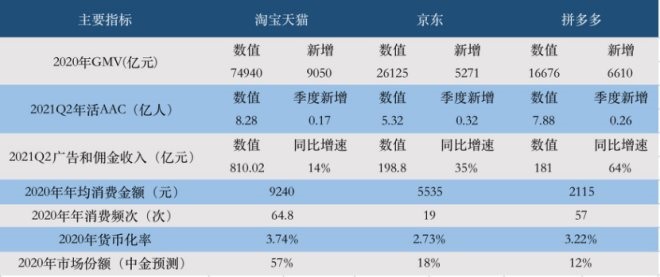 從GMV的絕對量、用戶年均消費金額、貨幣化率等關(guān)鍵運營指標(biāo)來看,淘寶天貓仍然具備絕對優(yōu)勢。2020年淘寶天貓的GMV是京東的3倍以上、拼多多的4倍以上,同期,淘寶天貓的人均消費金額達到9240元,京東為5000元左右、而拼多多僅為2115元,貨幣化率方面的差異則更為明顯,淘寶天貓在大基數(shù)之下仍維持了3.74%的較高水平;從相對增量來看,2020年,淘寶天貓在較高總量的前提下實現(xiàn)了9000億+的GMV增長,同期京東和拼多多分別為5000億+和6000億+。