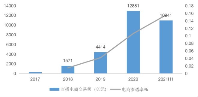 根據(jù)《2021年中國直播電商行業(yè)報告》的數(shù)據(jù),2020年,我國直播電商的規(guī)模已經(jīng)達到1.29萬億元,2018-2020年的CAGR高達220.50%;同期,直播電商在大電商行業(yè)的滲透率達到了10.60%,直播電商已經(jīng)變成了電商市場常態(tài)化的營銷方式和營銷手段。