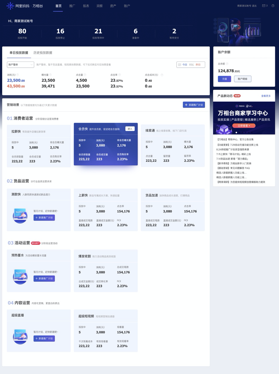 和以往以競(jìng)價(jià)排名的鉆展或直通車不同,萬相臺(tái)不只是為某一款商品解決流量問題,更像是一種品牌經(jīng)營(yíng)模式的指引:它分為消費(fèi)者運(yùn)營(yíng)、貨品運(yùn)營(yíng)、活動(dòng)場(chǎng)景、內(nèi)容營(yíng)銷等幾個(gè)主要場(chǎng)景,每個(gè)大場(chǎng)景下面又有“拉新快”、“會(huì)員快”、“測(cè)款快”、“上新快”等多個(gè)細(xì)分場(chǎng)景。