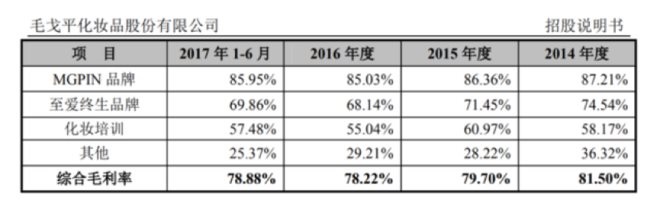 根據(jù)招股書,毛戈平的主要收入來源于兩個彩妝品牌(MGPIN及至愛終生)和化妝學校的培訓業(yè)務。根據(jù)證監(jiān)會上截止于2017年9月的招股書,在2014至2017年上半年,毛戈平實現(xiàn)營收分別為2.80、3.21、3.43和2.01億元。同期歸母凈利潤分別為4711.26、5462.47、5331.97和3561.97萬元。