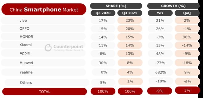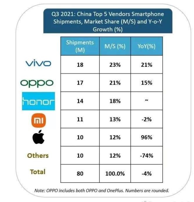 具體而言,三季度vivo和OPPO分別憑借23%、20%的市場份額占據(jù)國內(nèi)手機(jī)市場的前兩名。小米14%的市場份額被榮耀15%的市場份額超過,從第二名跌落到第四名。
