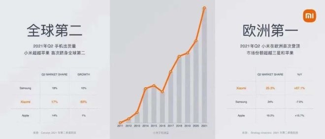 據(jù)國際數(shù)據(jù)機(jī)構(gòu)Canalys發(fā)布的最新數(shù)據(jù)顯示,2021年二季度,小米在65個(gè)國家和地區(qū)智能手機(jī)市場占有率排名前五,在22個(gè)國家和地區(qū)智能手機(jī)市場占有率排名第一。在歐洲市場,二季度小米更是拿下了第一名,是中國手機(jī)廠商中的首例。